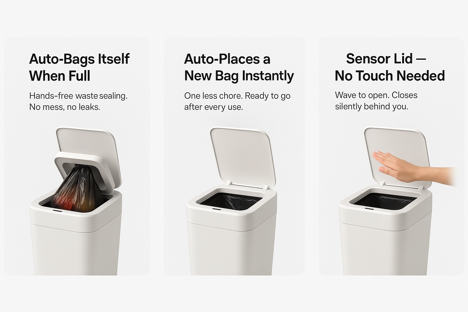 - Auto-Bagging System: The SmartBin takes the hassle out of waste disposal with its cutting-edge auto-bagging feature. Automatically dispense and place a new bag every time you remove the full one, ensuring a clean and efficient process with zero manual effort.